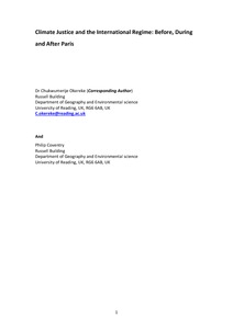 Okereke, C. and Coventry, P. (2016) Climate justice and the international regime: before, during and after Paris. Wiley Interdisciplinary Reviews: Climate Change, 7 (6). pp. 834-851. ISSN 1757-7799 doi: 10.1002/wcc.419