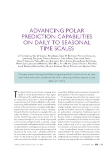 Jung, T., Gordon, N. D., Bauer, P., Bromwich, D. H., Chevallier, M., Day, J. J., Dawson, J., Doblas-Reyes, F., Fairall, C., Goessling, H. F., Holland, M., Inoue, J., Iversen, T., Klebe, S., Lemke, P., Losch, M., Makshtas, A., Mills, B., Nurmi, P., Perovich, D., Reid, P., Renfrew, I. A., Smith, G., Svensson, G., Tolstykh, M. and Yang, Q. (2016) Advancing polar prediction capabilities on daily to seasonal time scales. Bulletin of the American Meteorological Society, 97 (9). pp. 1631-1647. ISSN 1520-0477 doi: 10.1175/BAMS-D-14-00246.1