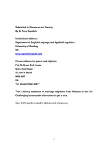 Capstick, T. ORCID: https://orcid.org/0000-0002-5145-7903 (2016) Literacy mediation in marriage migration from Pakistan to the United Kingdom: appropriating bureaucratic discourses to get a visa. Discourse and Society, 27 (5). pp. 481-499. ISSN 0957-9265 doi: 10.1177/0957926516651220