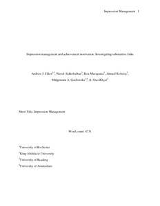 Elliot, A., J., Aldhobaiban, N., Murayama, K., Kobeisy, A., Gocłowska, M. A. and Khyat, A. (2018) Impression management and achievement motivation: investigating substantive links. International Journal of Psychology, 53 (1). pp. 16-22. ISSN 0020-7594 doi: 10.1002/ijop.12252