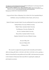 Marsh, H. W., Pekrun, R., Parker, P. D., Murayama, K., Guo, J., Dicke, T. and Lichtenfeld, S. (2017) Long-term positive effects of repeating a year in school: six-year longitudinal study of self-beliefs, anxiety, social relations, school grades, and test scores. Journal of Educational Psychology, 109 (3). pp. 425-438. ISSN 1939-2176 doi: 10.1037/edu0000144