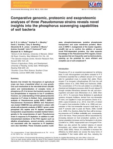 Lidbury, I. D. E. A., Murphy, A., Scanlan, D. J., Bending, G. D., Jones, A. M. E., Moore, J. D., Goodall, A., Hammond, J. P. ORCID: https://orcid.org/0000-0002-6241-3551 and Wellington, E. M. H. (2016) Comparative genomic, proteomic and exoproteomic analyses of three Pseudomonas strains reveals novel insights into the phosphorus scavenging capabilities of soil bacteria. Environmental Microbiology, 18 (10). pp. 3535-3549. ISSN 1462-2920 doi: 10.1111/1462-2920.13390