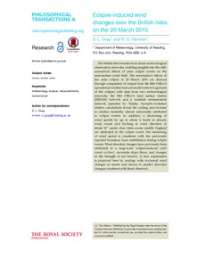 Gray, S. L. ORCID: https://orcid.org/0000-0001-8658-362X and Harrison, R. G. ORCID: https://orcid.org/0000-0003-0693-347X (2016) Eclipse-induced wind changes over the British Isles on the 20 March 2015. Philosophical Transactions of the Royal Society A: Mathematical, Physical and Engineering Sciences, 374 (2077). 20150224. ISSN 1364-503X doi: 10.1098/rsta.2015.0224 (themed issue: Atmospheric effects of solar eclipses stimulated by the 2015 UK eclipse)