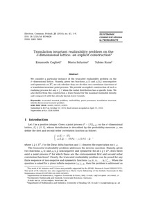 Kuna, T., Caglioti, E. and Infusino, M. (2016) Translation invariant realizability problem on the d-dimensional lattice: an explicit construction. Electronic Communications in Probability, 21. 45. ISSN 1083-589X doi: 10.1214/16-ECP4620