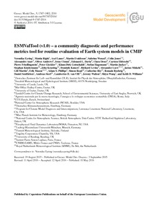 Eyring, V., Righi, M., Lauer, A., Evaldsson, M., Wenzel, S., Jones, C., Anav, A., Andrews, O., Cionni, I., Davin, E. L., Deser, C., Ehbrecht, C., Friedlingstein, P., Gleckler, P., Gottschaldt, K.-D., Hagemann, S., Juckes, M., Kindermann, S., Krasting, J., Kunert, D., Levine, R., Loew, A., Mäkelä, J., Martin, G., Mason, E., Phillips, A. S., Read, S., Rio, C., Roehrig, R., Senftleben, D., Sterl, A., van Ulft, L. H., Walton, J., Wang, S. and Williams, K. D. (2016) ESMValTool (v1.0) – a community diagnostic and performance metrics tool for routine evaluation of Earth system models in CMIP. Geoscientific Model Development, 9 (5). pp. 1747-1802. ISSN 1991-9603 doi: 10.5194/gmd-9-1747-2016