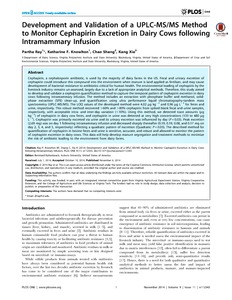 Cephapirin, a cephalosporin antibiotic, is used by the majority of dairy farms in the US. Fecal and urinary excretion of cephapirin could introduce this compound into the environment when manure is land applied as fertilizer, and may cause development of bacterial resistance to antibiotics critical for human health. The environmental loading of cephapirin by the livestock industry remains un-assessed, largely due to a lack of appropriate analytical methods. Therefore, this study aimed to develop and validate a cephapirin quantification method to capture the temporal pattern of cephapirin excretion in dairy cows following intramammary infusion. The method includes an extraction with phosphate buffer and methanol, solidphase extraction (SPE) clean-up, and quantification using ultra performance liquid chromatography-tandem mass spectrometry (UPLC-MS/MS). The LOQ values of the developed method were 4.02 mg kg21 and 0.96 mg L21 for feces and urine, respectively. This robust method recovered .60% and .80% cephapirin from spiked blank fecal and urine samples, respectively, with acceptable intra- and inter-day variation (,10%). Using this method, we detected trace amounts (mg kg21) of cephapirin in dairy cow feces, and cephapirin in urine was detected at very high concentrations (133 to 480 mg L21). Cephapirin was primarily excreted via urine and its urinary excretion was influenced by day (P = 0.03). Peak excretion (2.69 mg) was on day 1 following intramammary infusion and decreased sharply thereafter (0.19, 0.19, 0.08, and 0.17 mg on day 2, 3, 4, and 5, respectively) reflecting a quadratic pattern of excretion (Quadratic: P = 0.03). The described method for quantification of cephapirin in bovine feces and urine is sensitive, accurate, and robust and allowed to monitor the pattern of cephapirin excretion in dairy cows. This data will help develop manure segregation and treatment methods to minimize the risk of antibiotic loading to the environment from dairy farms.