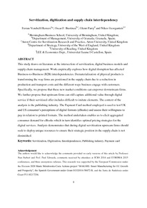 This study draws on literature at the intersection of servitization, digital business models and supply chain management. Work empirically explores how digital disruption has affected Business-to-Business (B2B) interdependencies. Dematerialization of physical products is transforming the way firms are positioned in the supply chain due to a reduction in production and transport costs and the different ways business engage with customers. Specifically, we propose that these new market conditions can empower downstream firms. We further propose that upstream firms can still capture additional value through digital service if their servitized offer includes difficult to imitate elements. The context of the analysis is the publishing industry. The Payment Card method employed is used to test UK and US consumer’s perceptions of digital formats (eBooks) and assess their willingness to pay in relation to printed formats. The method undertaken enables us to elicit aggregated consumer demand for eBooks which in turn identifies optimal pricing strategies for the digital services. Analysis demonstrates that during digital servitization upstream firms should seek to deploy unique resources to ensure their strategic position in the supply chain is not diminished.
