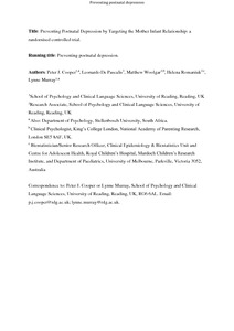 Cooper, P. J., De Pascalis, L., Woolgar, M., Romaniuk, H. and Murray, L. (2015) Attempting to prevent postnatal depression by targeting the mother–infant relationship: a randomised controlled trial. Primary Health Care Research & Development, 16 (4). pp. 383-397. ISSN 1477-1128 doi: 10.1017/S1463423614000401