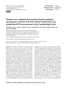 We present cross-validation of remote sensing measurements of methane profiles in the Canadian high Arctic. Accurate and precise measurements of methane are essential to understand quantitatively its role in the climate system and in global change. Here, we show a cross-validation between three data sets: two from spaceborne instruments and one from a ground-based instrument. All are Fourier transform spectrometers (FTSs). We consider the Canadian SCISAT Atmospheric Chemistry Experiment (ACE)-FTS, a solar occultation infrared spectrometer operating since 2004, and the thermal infrared band of the Japanese Greenhouse Gases Observing Satellite (GOSAT) Thermal And Near infrared Sensor for carbon Observation (TANSO)-FTS, a nadir/off-nadir scanning FTS instrument operating at solar and terrestrial infrared wavelengths, since 2009. The ground-based instrument is a Bruker 125HR Fourier transform infrared (FTIR) spectrometer, measuring mid-infrared solar absorption spectra at the Polar Environment Atmospheric Research Laboratory (PEARL) Ridge Laboratory at Eureka, Nunavut (80° N, 86° W) since 2006. For each pair of instruments, measurements are collocated within 500 km and 24 h. An additional collocation criterion based on potential vorticity values was found not to significantly affect differences between measurements. Profiles are regridded to a common vertical grid for each comparison set. To account for differing vertical resolutions, ACE-FTS measurements are smoothed to the resolution of either PEARL-FTS or TANSO-FTS, and PEARL-FTS measurements are smoothed to the TANSO-FTS resolution. Differences for each pair are examined in terms of profile and partial columns. During the period considered, the number of collocations for each pair is large enough to obtain a good sample size (from several hundred to tens of thousands depending on pair and configuration). Considering full profiles, the degrees of freedom for signal (DOFS) are between 0.2 and 0.7 for TANSO-FTS and between 1.5 and 3 for PEARL-FTS, while ACE-FTS has considerably more information (roughly 1 DOFS per altitude level). We take partial columns between roughly 5 and 30 km for the ACE-FTS–PEARL-FTS comparison, and between 5 and 10 km for the other pairs. The DOFS for the partial columns are between 1.2 and 2 for PEARL-FTS collocated with ACE-FTS, between 0.1 and 0.5 for PEARL-FTS collocated with TANSO-FTS or for TANSO-FTS collocated with either other instrument, while ACE-FTS has much higher information content. For all pairs, the partial column differences are within ±3 × 1022 molecules cm−2. Expressed as median ± median absolute deviation (expressed in partial column units or as a percentage), these differences are 0.11 ± 9.60  × 1020 molecules cm−2 (0.012 ± 1.018 %) for TANSO-FTS–PEARL-FTS, −2.6 ± 2.6 × 1021  cm−2 (−1.6 ± 1.6 %) for ACE-FTS–PEARL-FTS, and 7.4 ± 6.0 × 1020 molecules cm−2 (0.78 ± 0.64 %) for TANSO-FTS–ACE-FTS. The differences for ACE-FTS–PEARL-FTS and TANSO-FTS–PEARL-FTS partial columns decrease significantly as a function of PEARL partial columns, whereas the range of partial column values for TANSO-FTS–ACE-FTS collocations is too small to draw any conclusion on its dependence on ACE-FTS partial columns.
