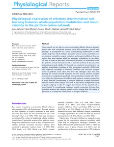 Jammal, L., Whalley, B., Ghosh, S., Lamrecht, R. and Barkai, E. (2016) Physiological expression of olfactory discrimination rule learning balances whole-population modulation and circuit stability in the piriform cortex network. Physiological Reports, 4 (14). e12830. ISSN 2051-817X doi: 10.14814/phy2.12830