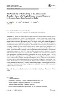 For 24 h we measured continuously the variability of atmospheric refractivity over a volcano on the tropical island of Montserrat using a ground-based radar interferometer. We observed variations in phase that we interpret as due to changing water vapour on the propagation path between the radar and the volcano and we present them here in the context of the behaviour of the atmospheric boundary layer over the island. The water vapour behaviour was forced by diurnal processes, the passage of a synoptic-scale system and the presence of a plume of volcanic gas. The interferometer collected images of amplitude and phase every minute. From pairs of phase images, interferograms were calculated and analyzed every minute and averaged hourly, together with contemporaneous measurements of zenith delays estimated from a network of 14 GPS receivers. The standard deviation of phase at two sites on the volcano surface spanned a range of about 1–5 radians, the lowest values occurring at night on the lower slopes and the highest values during the day on the upper slopes. This was also reflected in spatial patterns of variability. Two-dimensional profiles of radar-measured delays were modelled using an atmosphere with water vapour content decreasing upwards and water vapour variability increasing upwards. Estimates of the effect of changing water vapour flux from the volcanic plume indicate that it should contribute only a few percent to this atmospheric variability. A diurnal cycle within the lower boundary layer producing a turbulence-dominated mixed layer during the day and stable layers at night is consistent with the observed refractivity.