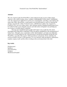 The role of artists in the First World War is often understood only in terms of their artistic response to the conflict in paint, music, sculpture or photography. In fact, artists’ contributions were also engaged at an applied level, in the areas of propaganda, camouflage, map-making and many other trades. Beyond this, a small number actively participated as artists in repairing the damage caused by the conflict. Frederick Coates, a British-born sculptor who emigrated to Canada in 1913, was one of these artists. After enlisting with the Canadian Expeditionary Force, he worked for three years alongside surgeons and other artists in England to try and help give new features to facially injured combatants. Drawing upon unpublished photographs and Coates’s own scrapbooks, this article investigates the young artist’s experience of the war and his contribution to the reconstruction of broken faces. Through a close examination of this ‘facial architect’, as Coates was called, this article gives a fresh insight into the work performed in maxillofacial hospitals during the First World War, especially with regard to Allied practitioners and patients. It also underlines the newly developed concept of, and importance of, cross-national, multi-disciplinary collaboration in plastic surgery wards, and the effects working in this environment had on the staff.