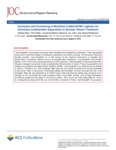Synthesis and screening of modified 6,6′-Bis(5,5,8,8-tetramethyl-5,6,7,8-tetrahydrobenzo[e][1,2,4]triazin-3-yl)-2,2′-bipyridine ligands for actinide and lanthanide separation in nuclear waste treatment.