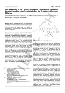 Self-assembly of the cyclic lipopeptide daptomycin: spherical micelle formation does not depend on the presence of calcium chloride.