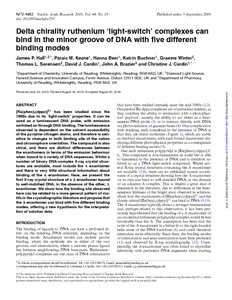 Hall, J. P. ORCID: https://orcid.org/0000-0003-3716-4378, Keane, P. M., Beer, H., Buchner, K., Winter, G., Sorensen, T. L., Cardin, D. J., Brazier, J. A. ORCID: https://orcid.org/0000-0002-4952-584X and Cardin, C. J. ORCID: https://orcid.org/0000-0002-2556-9995 (2016) Delta chirality ruthenium ‘light-switch’ complexes can bind in the minor groove of DNA with five different binding modes. Nucleic Acids Research, 44 (19). pp. 9472-9482. ISSN 1362-4962 doi: 10.1093/nar/gkw753