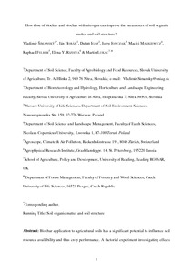 Biochar application to agricultural soils has a significant potential to influence soil resource availability and thus crop performance. A factorial experiment investigating effects of different biochar application rates combined with nitrogen fertilizer was conducted in field conditions on a Haplic Luvisol. The aim of this study was to evaluate the effects of biochar and biochar combined with fertilization on soil organic matter and soil structure parameters. The treatments comprised combinations of biochar application of 0, 10 and 20 t ha−1 (B0, B10 and B20) and 0, 40 and 80 kg N ha−1 of nitrogen fertilizer (N0, N40, N80) applied in a full-factorial design. Biochar application rate of 20 t ha−1 significantly increased soil organic carbon content (SOC) and non-labile carbon content (CNL), but decreased carbon lability (LC). The addition of biochar at 10 t ha−1 together with 40 and 80 kg N ha−1 significantly increased the values of SOC and CNL. On the other hand, B10N80 treatment resulted in a considerable decrease of carbon lability (LC). Overall, the lowest average content of water-stable micro-aggregates was found in the B20N80 treatment and then with B10N0 < B20N40 < B20N0 < B10N80 < B0N0 < B10N40. Biochar applied at 20 t ha−1 increased the critical level of soil organic matter and decreased the crusting index.