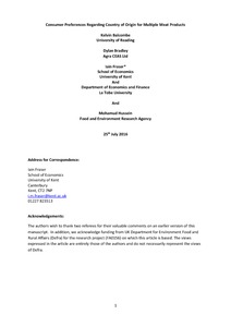 Balcombe, K., Bradley, D., Fraser, I. and Hussein, M. (2016) Consumer preferences regarding country of origin for multiple meat products. Food Policy, 64. pp. 49-62. ISSN 0306-9192 doi: 10.1016/j.foodpol.2016.09.008