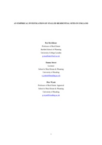 McAllister, P., Street, E. ORCID: https://orcid.org/0000-0002-8987-5916 and Wyatt, P. ORCID: https://orcid.org/0000-0002-9091-2729 (2016) An empirical investigation of stalled residential sites in England. Planning Practice and Research, 31 (2). pp. 132-153. ISSN 1360-0583 doi: 10.1080/02697459.2015.1115658