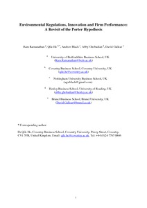 Ramanathan, R., He, Q., Black, A., Ghobadian, A. and Gallear, D. (2017) Environmental regulations, innovation and firm performance: a revisit of the Porter hypothesis. Journal of Cleaner Production, 155. pp. 79-92. ISSN 0959-6526 doi: 10.1016/j.jclepro.2016.08.116