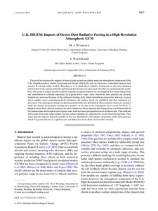 Woodage, M. and Woodward, S. (2014) U.K. HiGEM: impacts of desert dust radiative forcing in a high-resolution atmospheric GCM. Journal Of Climate, 27 (15). pp. 5907-5928. ISSN 1520-0442 doi: 10.1175/JCLI-D-13-00556.1
