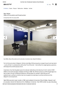 Deep Freezer I worked on a new commission for Objectif, in the basement space. The new work further develops my on-going interest in bitumen, and its temporal qualities. Drawing on the work I made with Neal White, A Quantity of Easing we created two bitumen forms, taking open cast diamond mines as a starting point (Antwerp being a capital of Diamonds in the world). Situated on a plinth with an interior visible along the perimeter of the top surface, these forms collapse through holes into the bright space below. This inversion of the extraction process, sees the bitumen slowly unfold onto the negative void of the casts. From above, the forms simply dissolve into the plinth upon which they are placed. The link between oil, the basis of the bitumen, and mining or drilling of resources, waste and the void, is implicit. The plinth itself is shown in a darkened space accessed through a Kiosk placed in the courtyard outside of the gallery. Visitors slowly lowered themselves down a ladder in to the darkness below. Facing them was the plinth, and around them the resonant audio of open source seismic data taken from a global array of sensors - developed by Anna Troisi with the Office of Experiments. Far to the left in the bottom of a liftshaft, a video plays back captured materials from diamond displays. Exiting, the visitor leaves up a stairwell to an upstairs space, which is lit by orange fluorescent tubes. A text taken from Robert Smithson text on Spiral Jetty, alluding to land art and media, is the only other element in the space. There is no access to the gallery and visitors leave via the roller door half opened to the courtyard. Going through the main entrance to the gallery upstairs, the Speedie Telstar – a work commissioned by TULCA Galway and on loan from the Museum of Computing and Communications, Galway was exhibited among works made by White that reflect on recent projects and fieldwork concerning key issues of time, with the ideas of global communications and global resource extraction. Project Elements: Deep Freezer Two bitumen casts approx 40 x 40 cm. Custom made white plinth with floating top. LED lights, wood . Speedie Telstar Sculpture; Original Front page of the New York Times following the Speedie Telstar Launch 1962; Assorted informational videos and propoganda on DVD. The Speedie Telster is a sculpture in aluminium and steel with a range of recent technologies and traditional techniques used to finish details, from 3d printing to watercolour for the solar panels. The sculpture is approxiamtely the size of the orginal at 30 inches diameter.