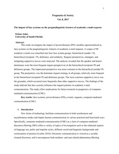 This study investigates the impact of power/distance (PD) variables operationalized as face systems on the pragmalinguistic features of academic e-mail requests. A corpus of 90 academic e-mails was classified into four face system groups: hierarchical (sender +P), hierarchical (recipient +P), deference, and solidarity. Request perspectives, strategies, and mitigating supportive moves were analyzed. The analysis revealed that the speaker and hearer dominance were the most frequent request perspectives in the hierarchical (recipient+P) and deference groups. The impersonal perspective was more common in the hierarchical (sender+P) group. The preparatory was the dominant request strategy in all groups, relatively more frequent in the hierarchical (recipient+P) and deference groups. The most common supportive move was the grounder, which occurred more frequently than other supportive moves. The findings of the study indicate that face systems influence the request patterns in academic e-mail communication. The study offers implications for future research on pragmatics of computermediated communication (CMC).