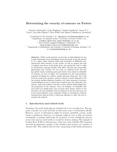 Giasemidis, G., Singleton, C., Agrafiotis, I., Nurse, J. R. C., Pilgrim, A., Willis, C. and Vukadinovic Greetham, D. (2016) Determining the veracity of rumours on Twitter. In: 8th International Conference on Social Informatics, SocInfo 2016, 15-17 November 2016, Seattle, USA, pp. 185-205.