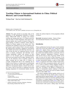 Wang, W. and Curdt-Christiansen, X.-L. (2016) Teaching Chinese to international students in China: political rhetoric and ground realities. The Asia-Pacific Education Researcher, 25 (5-6). pp. 723-734. ISSN 0119-5646 doi: 10.1007/s40299-016-0316-z