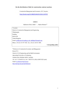 Ballesteros-Pérez, P. and Skitmore, M. (2017) On the distribution of bids for construction contract auctions. Construction Management and Economics, 35 (3). pp. 106-121. ISSN 0144-6193 doi: 10.1080/01446193.2016.1247972
