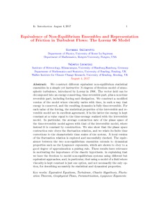 We construct different equivalent non-equilibrium statistical ensembles in a simple yet instructive \(N\)-degrees of freedom model of atmospheric turbulence, introduced by Lorenz in 1996. The vector field can be decomposed into an energy-conserving, time-reversible part, plus a non-time reversible part, including forcing and dissipation. We construct a modified version of the model where viscosity varies with time, in such a way that energy is conserved, and the resulting dynamics is fully time-reversible. For each value of the forcing, the statistical properties of the irreversible and reversible model are in excellent agreement, if in the latter the energy is kept constant at a value equal to the time-average realized with the irreversible model. In particular, the average contraction rate of the phase space of the time-reversible model agrees with that of the irreversible model, where instead it is constant by construction. We also show that the phase space contraction rate obeys the fluctuation relation, and we relate its finite time corrections to the characteristic time scales of the system. A local version of the fluctuation relation is explored and successfully checked. The equivalence between the two non-equilibrium ensembles extends to dynamical properties such as the Lyapunov exponents, which are shown to obey to a good degree of approximation a pairing rule. These results have relevance in motivating the importance of the chaotic hypothesis. in explaining that we have the freedom to model non-equilibrium systems using different but equivalent approaches, and, in particular, that using a model of a fluid where viscosity is kept constant is just one option, and not necessarily the only option, for describing accurately its statistical and dynamical properties.