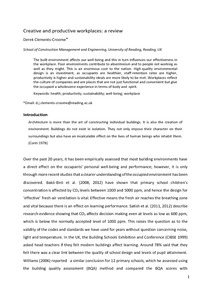 Clements-Croome, D. (2015) Creative and productive workplaces: a review. Intelligent Buildings International, 7 (4). pp. 164-183. ISSN 1750-8975 doi: 10.1080/17508975.2015.1019698