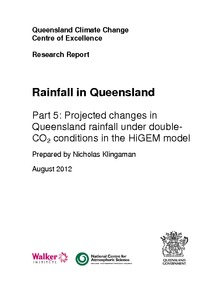 This report analyses projected changes in Queensland rainfall from the HiGEM global climate model under atmospheric carbon dioxide (CO2) concentrations of approximately 690 parts per million (ppm), equivalent to the CO2 concentration in the late 21st century under a moderate (IPCC SRES (2012) A1B) emissions scenario. HiGEM is a high-resolution version of the U.K. Met Office model (HadGEM1). Previously reported research found that with present-day CO2, HiGEM accurately simulated many observed climate drivers of Queensland rainfall, including the El Niño Southern Oscillation; this increases our confidence in the model’s projections of rainfall change. The HiGEM model projects that average surface temperatures in Queensland will warm by approximately 2°C under doubled CO2, with the strongest warming in autumn and winter. Consistent with many other studies, the land warms by more than the ocean, leading to greater warming inland in Queensland and less along the coast. While HiGEM projects small changes to annual-total rainfall, the November–April wet season becomes compressed: 10–20 per cent more rain falls during January and February, with 10–40 per cent less in November, March and April. The Queensland wet season begins up to 10 days later—particularly along the coast—and ends up to 20 days earlier—particularly in the southwest. Precipitation falls in fewer but much more intense events. The HiGEM model projects that Queensland will rely more strongly upon heavy mid-summer rains for its annual precipitation. This has important consequences for agriculture and for water storage. The frequency of extreme rain days (greater than 100 millimetre accumulation) in HiGEM increases by up to 40 per cent, particularly in summer during the intensified monsoon. HiGEM also projects that the average duration of extreme rainfall will rise (by 20 per cent) as will the area covered by each event (15 per cent). The number of light rain days (1–5 millimetre) is projected to decrease by 5–10 per cent. Tropical cyclones become slightly less frequent near Queensland. The HiGEM model projects that many climate drivers of rainfall will remain robust in a warmer world. The correlation with ENSO declines, but there are an inadequate number of ENSO events in the future-climate simulation on which to base firm conclusions. Rainfall variations in southwest and southeast Queensland become less connected to those in the rest of the state, mostly due to an earlier end of the wet season in those regions.