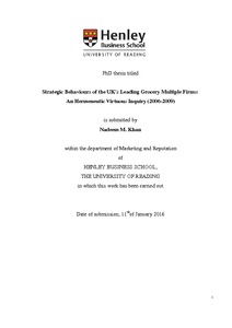 Khan, N. M. ORCID: https://orcid.org/0000-0001-6911-9737 (2016) Strategic behaviours of the UK's leading grocery multiple firms: an hermeneutic virtuous inquiry (2006-2009). PhD thesis, University of Reading.
