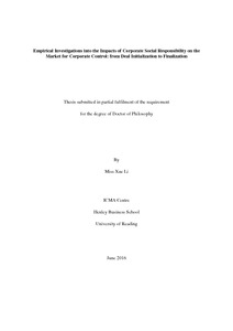 Li, X. (2016) Empirical investigations into the impacts of corporate responsibility on the market for corporate control: from deal initialization to finalization. PhD thesis, University of Reading.