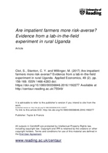 Clot, S. ORCID: https://orcid.org/0000-0002-4964-825X, Stanton, C. Y. and Willinger, M. (2017) Are impatient farmers more risk-averse? Evidence from a lab-in-the-field experiment in rural Uganda. Applied Economics, 49 (2). pp. 156-169. ISSN 1466-4283 doi: 10.1080/00036846.2016.1192277