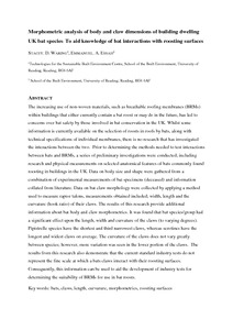The increasing use of non-woven materials, such as breathable roofing membranes (BRMs) within buildings that either currently contain a bat roost or may do in the future, has led to concerns over bat safety by those involved in bat conservation in the UK. Whilst some information is currently available on the selection of roosts in roofs by bats, along with technical specifications of individual membranes, there is no research that has investigated the interactions between the two. Prior to determining the methods needed to test interactions between bats and BRMs, a series of preliminary investigations were conducted; including research and physical measurements on selected anatomical features of bats commonly found roosting in buildings in the UK. Data on body size and shape were gathered from a combination of experimental measurements of bat specimens (deceased) and information collated from literature. Data on bat claw morphology were collected by applying a method used to measure raptor talons, measurements obtained included; width, length and the curvature (hook ratio) of their claws. The results of this research provide additional information about bat body and claw morphometrics. It was found that bat species/group had a significant effect upon the length, width and curvature of the claws (to varying degrees). Pipistrelle species have the shortest and third narrowest claws, whereas serotines have the longest and widest claws on average. The curvature of the claws does not vary greatly between species; however, more variation was seen in the lower portion of the claws. The results from this research also demonstrate that the current standard industry tests do not represent the fine scale at which a bats claws interact with their roosting surfaces. Consequently, this information can be used to aid the development of industry tests for determining the suitability of BRMs for use in bat roosts.