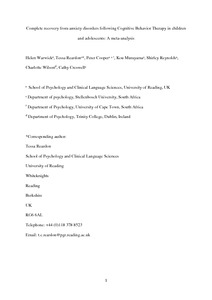 Warwick, H., Reardon, T., Cooper, P., Murayama, K., Reynolds, S., Wilson, C. and Creswell, C. (2017) Complete recovery from anxiety disorders following Cognitive Behavioural Therapy in children and adolescents: a meta analysis. Clinical Psychology Review, 52. pp. 77-91. ISSN 0272-7358 doi: 10.1016/j.cpr.2016.12.002