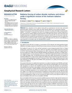 New calculations of the radiative forcing (RF) are presented for the three main well‐mixed greenhouse gases, methane, nitrous oxide, and carbon dioxide. Methane’s RF is particularly impacted because of the inclusion of the shortwave forcing; the 1750–2011 RF is about 25% higher (increasing from 0.48 W m−2 to 0.61 W m−2) compared to the value in the Intergovernmental Panel on Climate Change (IPCC) 2013 assessment; the 100 year global warming potential is 14% higher than the IPCC value. We present new simplified expressions to calculate RF. Unlike previous expressions used by IPCC, the new ones include the overlap between CO2 and N2O; for N2O forcing, the CO2 overlap can be as important as the CH4 overlap. The 1750–2011 CO2 RF is within 1% of IPCC’s value but is about 10% higher when CO2 amounts reach 2000 ppm, a value projected to be possible under the extended RCP8.5 scenario.