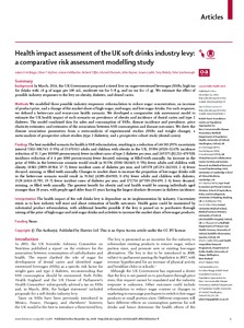 Briggs, A. D. M., Mytton, O. T., Kehlbacher, A., Tiffin, R., Elhussein, A., Rayner, M., Jebb, S. A., Blakely, T. and Scarborough, P. (2017) Health impact assessment of the UK soft drinks industry levy: a comparative risk assessment modelling study. Lancet Public Health, 2 (1). e15-e22. doi: 10.1016/S2468-2667(16)30037-8