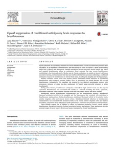 Hayen, A., Wanigasekera, V., Faull, O. K., Campbell, S. F., Garry, P. S., Raby, S. J. M., Robertson, J., Webster, R., Wise, R. G., Herigstad, M. and Pattinson, K. T. S. (2017) Opioid suppression of conditioned anticipatory brain responses to breathlessness. NeuroImage, 150. pp. 383-394. ISSN 1053-8119 doi: 10.1016/j.neuroimage.2017.01.005