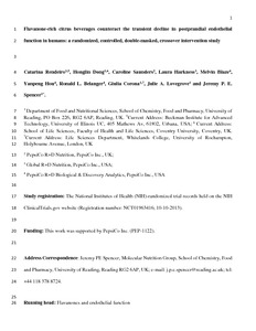 Rendeiro, C., Dong, H., Saunders, C., Harkness, L., Blaze, M., Hou, Y., Belanger, R. L., Corona, G., Lovegrove, J. A. ORCID: https://orcid.org/0000-0001-7633-9455 and Spencer, J. P. E. ORCID: https://orcid.org/0000-0003-2931-7274 (2016) Flavanone-rich citrus beverages counteract the transient decline in postprandial endothelial function in humans: a randomised, controlled, double-masked, cross-over intervention study. British Journal of Nutrition, 116 (12). pp. 1999-2010. ISSN 0007-1145 doi: 10.1017/S0007114516004219