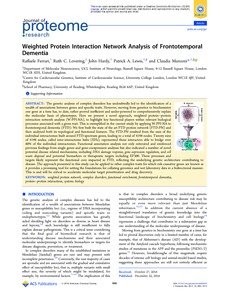 Ferrari, R., Lovering, R. C., Hardy, J., Lewis, P. A. and Manzoni, C. (2017) Weighted protein interaction network analysis of frontotemporal dementia. Journal of Proteome Research, 16 (2). pp. 999-1013. ISSN 1535-3907 doi: 10.1021/acs.jproteome.6b00934
