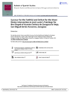 Lee, S. (2017) Succour for the faithful and defeat for the Moor: divine intervention in José Luzán's paintings for the Chapel of Nuestra Señora de Zaragoza la Vieja, San Miguel de los Navarros, Zaragoza. Bulletin of Spanish Studies, 94 (3). pp. 417-437. ISSN 1475-3820 doi: 10.1080/14753820.2016.1245028