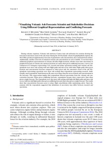 Mulder, K. J., Lickiss, M., Harvey, N. ORCID: https://orcid.org/0000-0003-0973-5794, Black, A., Charlton-Perez, A. ORCID: https://orcid.org/0000-0001-8179-6220, Dacre, H. ORCID: https://orcid.org/0000-0003-4328-9126 and McCloy, R. ORCID: https://orcid.org/0000-0003-2333-9640 (2017) Visualizing volcanic ash forecasts: scientist and stakeholder decisions using different graphical representations and conflicting forecasts. Weather, Climate and Society, 9 (3). pp. 333-348. ISSN 1948-8327 doi: 10.1175/WCAS-D-16-0062.1