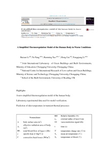Li, B., Yang, Y., Yao, R. ORCID: https://orcid.org/0000-0003-4269-7224, Liu, H. and Li, Y. (2017) A simplified thermoregulation model of the human body in warm conditions. Applied Ergonomics, 59 (A). pp. 387-400. ISSN 0003-6870 doi: 10.1016/j.apergo.2016.09.010