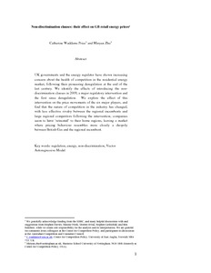 UK governments and the energy regulator have shown increasing concern about the health of competition in the residential energy market, following their pioneering deregulation at the end of the last century. We identify the effects of introducing the non-discrimination clauses in 2009, a major regulatory intervention and the first since deregulation. We explore the effect of this intervention on the price movements of the six major players, and find that the nature of competition in the industry has changed, with less effective rivalry between the regional incumbents and large regional competitors following the intervention; companies seem to have ‘retreated’ to their home regions, leaving a market where pricing behaviour resembles more closely a duopoly between British Gas and the regional incumbent.
