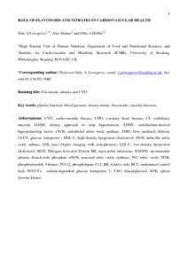 CVD remain the leading cause of death globally. Effective dietary strategies for their reduction are of high priority. Increasing evidence suggests that phytochemicals, particularly dietary flavonoids and nitrates, are key modulators of CVD risk reduction through impact on multiple risk factors. The aim of this review is to explore the evidence for the impact of flavonoid- and nitrate-rich foods and supplements on CVD risk, with specific reference to their importance as mediators of vascular health and platelet function. There is accumulating evidence to support benefits of dietary flavonoids on cardiovascular health. Dose-dependent recovery of endothelial function and lowering of blood pressure have been reported for the flavanol (-)-epicatechin, found in cocoa, apples and tea, through production and availability of endothelial nitric oxide (NO). Furthermore, flavonoids, including quercetin and its metabolites, reduce in vitro and ex vivo platelet function via inhibition of phosphorylation-dependent cellular signalling pathways, although further in vivo studies are required to substantiate these mechanistic effects. Hypotensive effects of dietary nitrates have been consistently reported in healthy subjects in acute and chronic settings, although there is less evidence for these effects in patient groups. Proposed mechanisms of actions include endothelial-independent NO availability, which is dependent on the entro-salivary circulation and microbial conversion of dietary nitrate to nitrite in the mouth. In conclusion, flavonoid- and nitrate-rich foods show promising effects on vascular function, yet further randomly controlled studies are required to confirm these findings and to determine effective doses.
