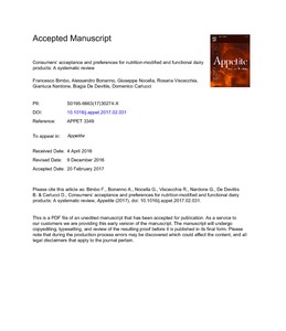 This systematic literature review collects and summarizes research on consumer acceptance and preferences for nutrition-modified and functional dairy products, to reconcile, and expand upon, the findings of previous studies. We find that female consumers show high acceptance for some functional dairy products, such as yogurt enriched with calcium, fiber and probiotics. Acceptance for functional dairy products increases among consumers with higher diet/health related knowledge, as well as with aging. General interest in health, food-neophobia and perceived self-efficacy seem also to contribute shaping the acceptance for functional dairy products. Furthermore, products with “natural” matches between carriers and ingredients have the highest level of acceptance among consumers. Last, we find that brand familiarity drives consumers with low interest in health to increase their acceptance and preference for health enhanced dairy products, such as probiotic yogurts, or those with a general function claim.