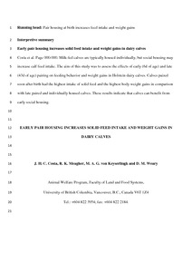 Costa, J. H. C., Meagher, R. K., von Keyserlingk, M. A. G. and Weary, D. M. (2015) Early pair housing increases solid feed intake and weight gains in dairy calves. Journal of Dairy Science, 98 (9). pp. 6381-6386. ISSN 0022-0302 doi: 10.3168/jds.2015-9395