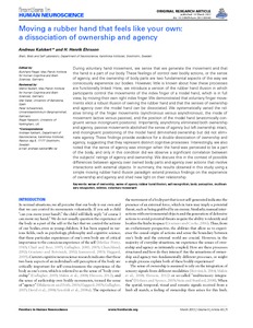 Kalckert, A. and Ehrsson, H. H. (2012) Moving a rubber hand that feels like your own: a dissociation of ownership and agency. Frontiers in Human Neuroscience, 6. 40. ISSN 1662-5161 doi: 10.3389/fnhum.2012.00040